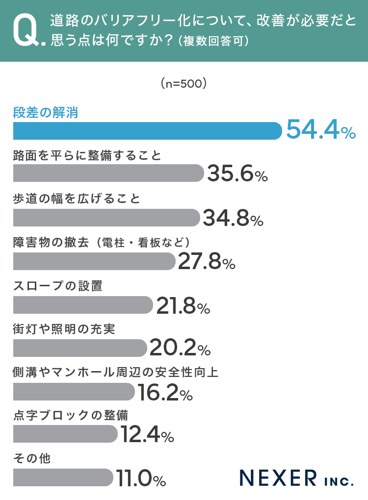最も多かったのは「段差の解消」で54.4%となり、過半数が課題として挙げる結果となりました。