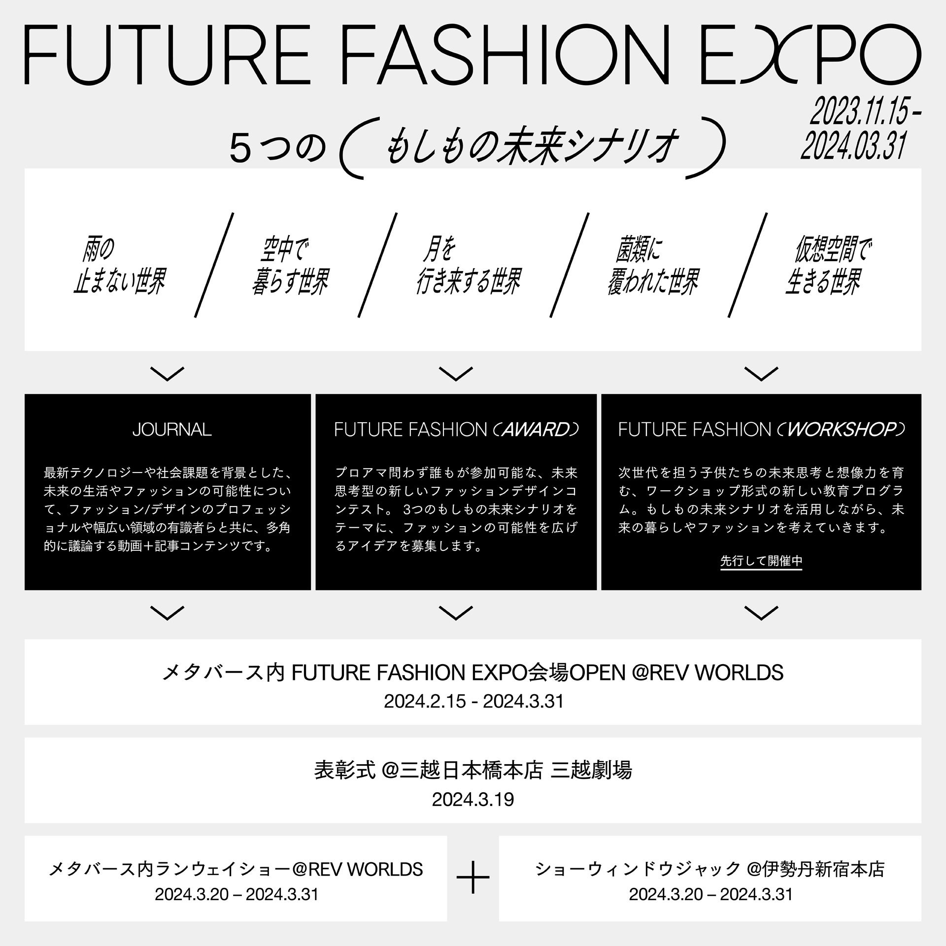三越伊勢丹にとって初めての取り組みとなる「FUTURE FASHION EXPO」は、現状の社会課題や最新技術から発想した「もしもの未来シナリオ」を題材とする、<FUTURE FASHION AWARD>、<FUTURE FASHION WORKSHOP>、<JOURNAL>などの企画から構成されるイベントです。