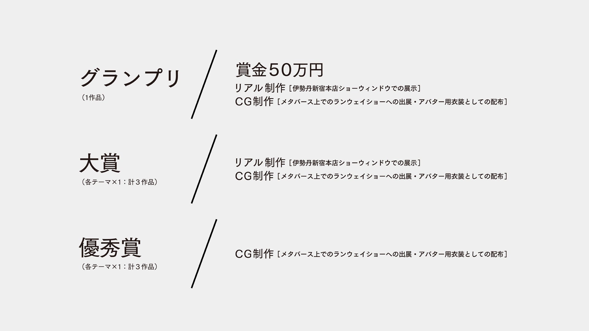 審査は、宮⽥ 裕章⽒(慶應義塾⼤学 教授)、村上 要⽒(『WWDJAPAN』編集⻑)、松島 倫明⽒(『WIRED』⽇本版 編集⻑)などの多様なバックグラウンドを有する有識者や専⾨家が参加。選出された受賞作品は、リアルとデジタルで服として形になり、伊勢丹新宿本店のショーウィンドウやメタバース空間にて展⽰される予定です。
