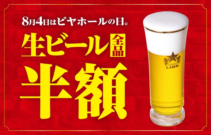 創業日である8月4日「ビヤホールの日」当日に限り、全国のサッポロライオンチェーン(一部店舗を除く)において、取扱いのある生ビール全品を終日半額にてご提供します。