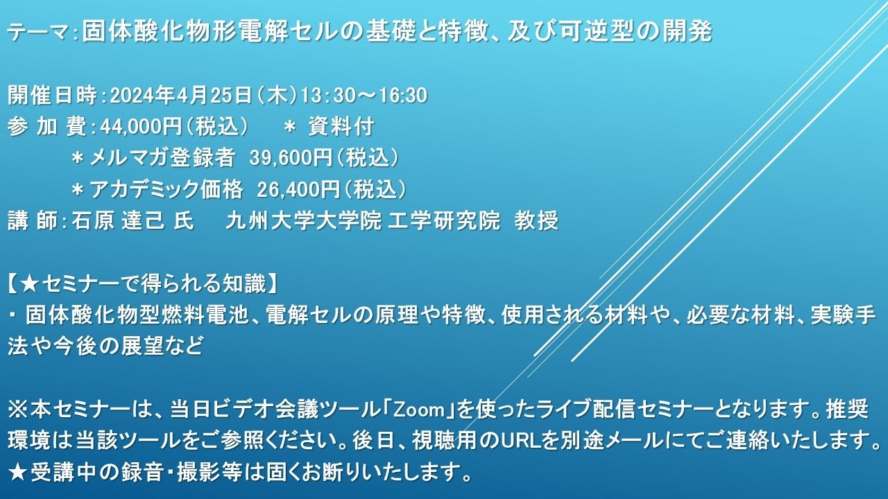 【ライブ配信セミナー】固体酸化物形電解セルの基礎と特徴、及び可逆型の開発 4月25日(木)開催 主催:(株)シーエムシー・リサーチ