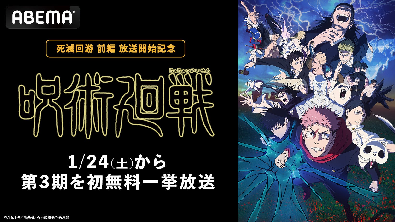 TVアニメ『呪術廻戦』第3期「死滅回游 前編」放送開始記念!「ABEMA」で1月24日(土)に第3期の初無料一挙放送が決定!第1期&第2期の全話無料一挙放送も