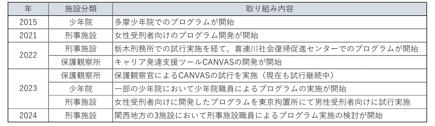 「多摩少年院」(2015年)でのプログラム実施を起点に、様々な刑事施設・少年院・保護観察所等の施設で展開しています。