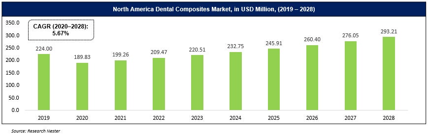 北米の歯科用コンポジット市場は、2019年の224.0 百万米ドルの収益から、2028年末までに293.21 百万米ドルの収益を獲得すると推定されています。さらに、この地域の市場は、2020ー2028年の予測期間中にに5.67%のCAGRで成長すると予想されます。