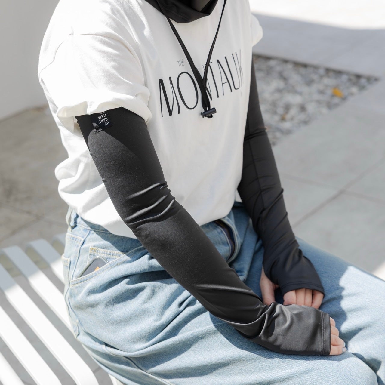 UPF50+で、紫外線からお肌を守ってくれるアームカバーは、二の腕までカバーでき55cm丈です。親指を通せるフィンガーホールがついており、手の甲もカバーできます。さらっとした肌触りで接触冷感付きなのも嬉しいポイント。シンプルなデザインで、どんなスタリングにも合わせやすいアイテムです。