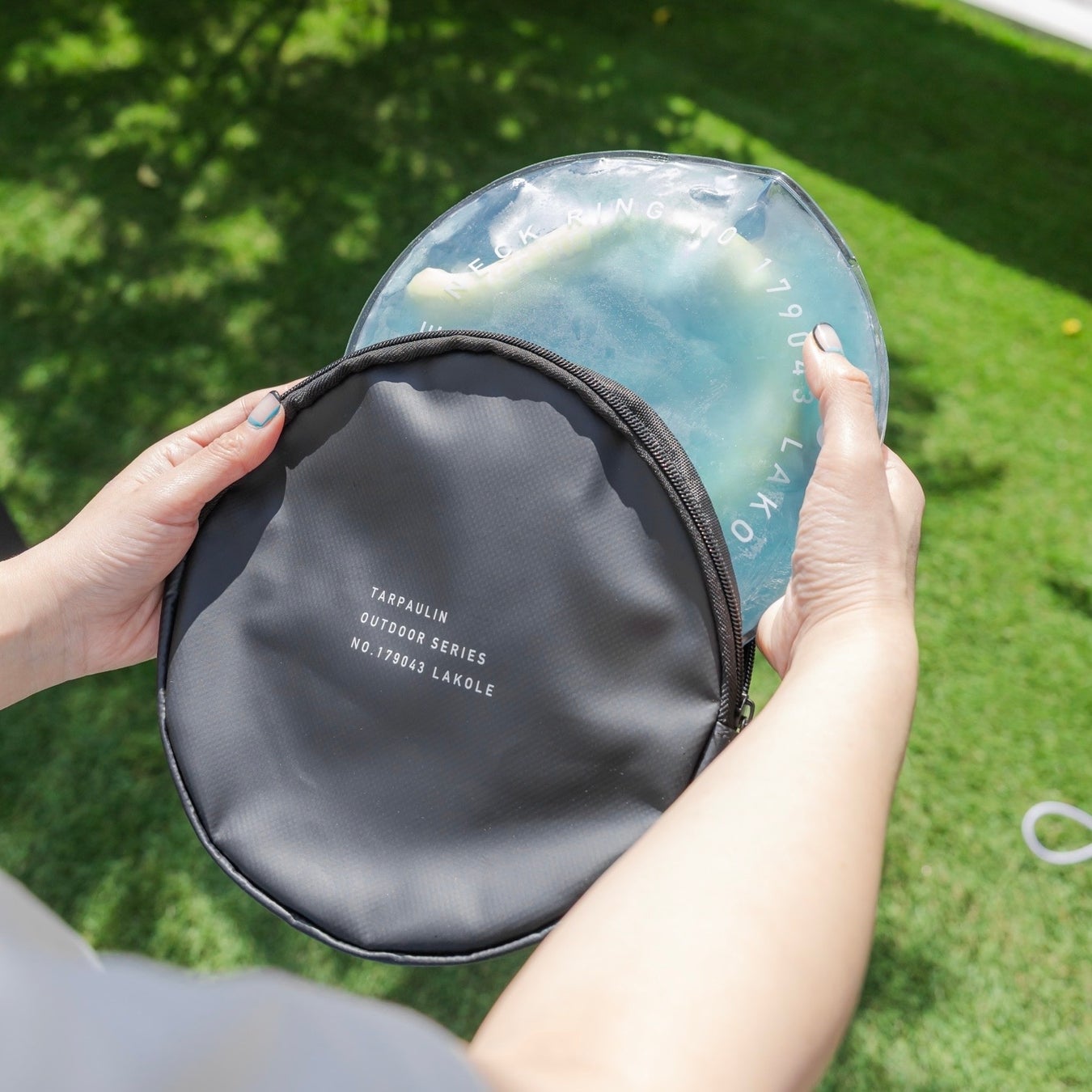 防水性のあるターポリン生地を使用した、丸型ポーチは、アイスネックリングを持ち運ぶのに最適なアイテム。 リング用保冷剤を中に入れることで保冷力がさらにアップし、常温に戻ってしまったアイスネックリングの再凍結に便利です。