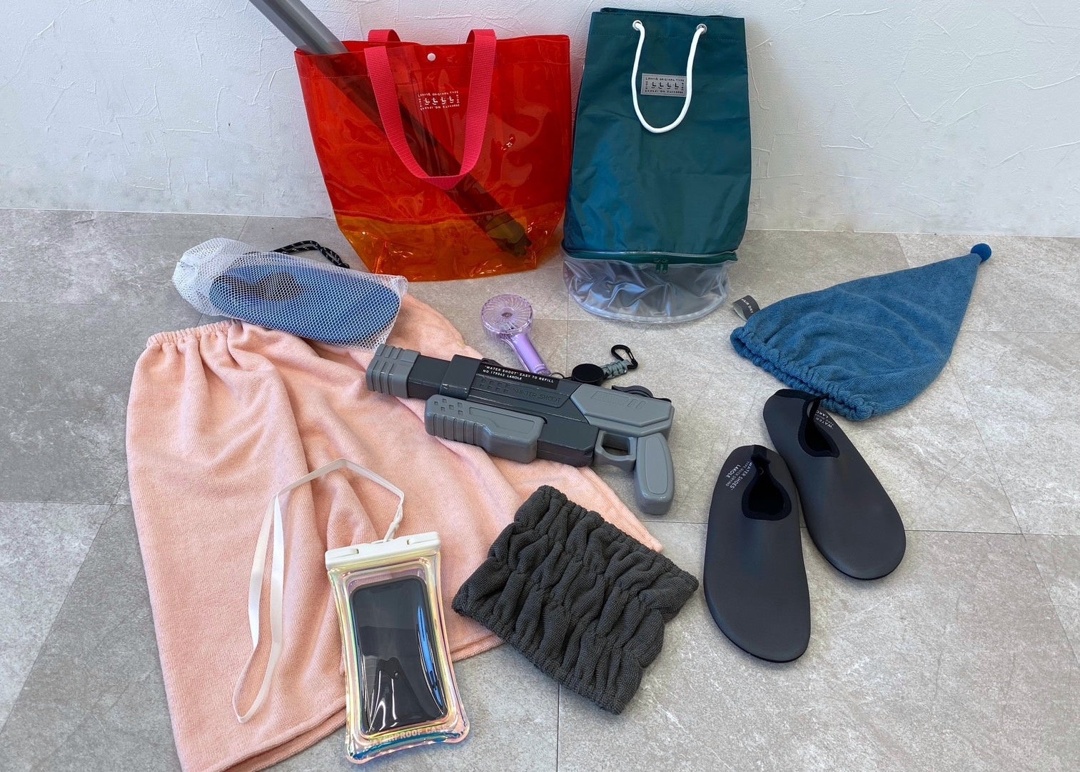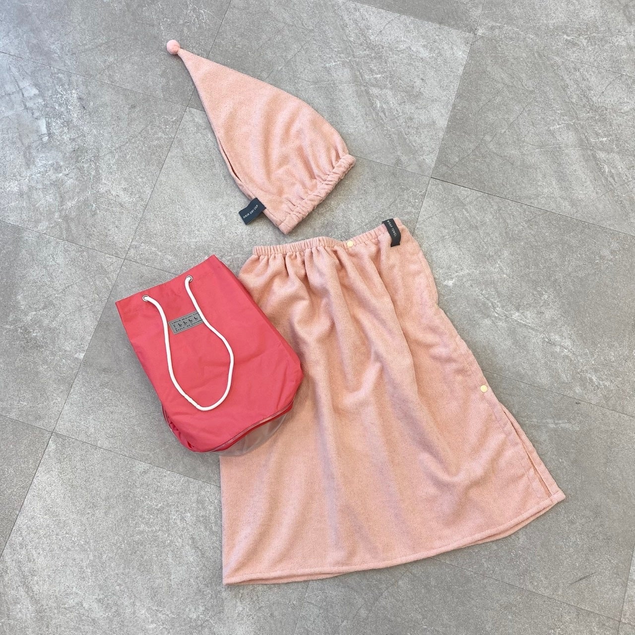 濡れた髪の毛や頭を包んで乾かしてくれるタオルキャップは後ろにホールがあるので、長い髪を出すことも可能。 筒形のプールバッグは上部と下部の二層式になっており、濡れたものを別にしたりビーチサンダルを入れたり、荷物も整理がしやすい形状です。