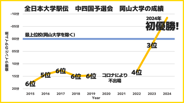 我々は「全国の常連へ」をテーマに今年度のチーム運営を進めてまいりました。全日本大学駅伝の出場権獲得により、岡山大学が出場可能な2つの学生三大駅伝の出場権を獲得したこととなります(箱根駅伝は関東の学連に属している大学のみ出場可)。スポーツ推薦制度もない、指導者もいない、全て学生自治で運営をしているチームが、2つの全国規模の駅伝への初出場を決めたことは快挙と言えます。