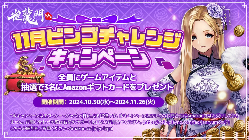 エヌ・シー・ジャパン株式会社(本社:東京都港区、代表取締役:林 元基(イム ウォンキ)、以下エヌシージャパン)は、PCとスマートフォン向け超美麗本格3D麻雀ゲーム『雀龍門M』にて、10月30日(水)より「ビンゴミッションイベント」の開催をお知らせします。