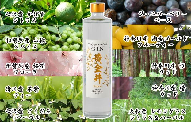 クラフトジン「黄金井」は、神奈川で採れる9種類のボタニカル素材とジンの軸となるジュニパーベリーをブレンドし黄金井酒造で製造した本格焼酎に合わせた黄金井独自スタイルのジンです。