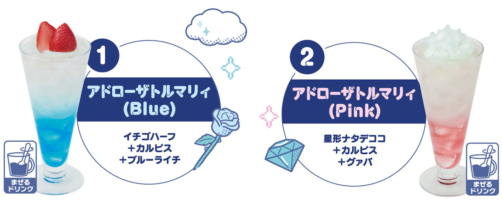 コラボドリンクは、株式会社サンリオの「アドローザトルマリィ」をイメージした「アドローザトルマリィ(Blue)」「アドローザトルマリィ(Pink)」の全2種をご用意します。