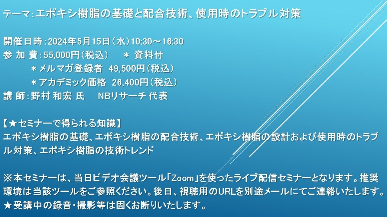 【ライブ配信セミナー】エポキシ樹脂の基礎と配合技術、使用時のトラブル対策 5月15日(水)開催 主催:(株)シーエムシー・リサーチ