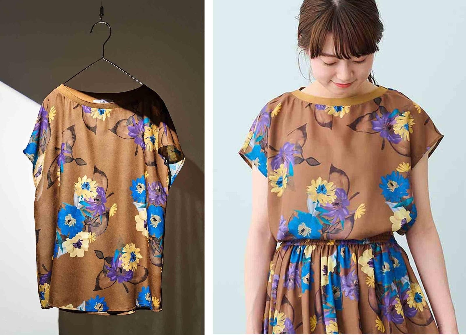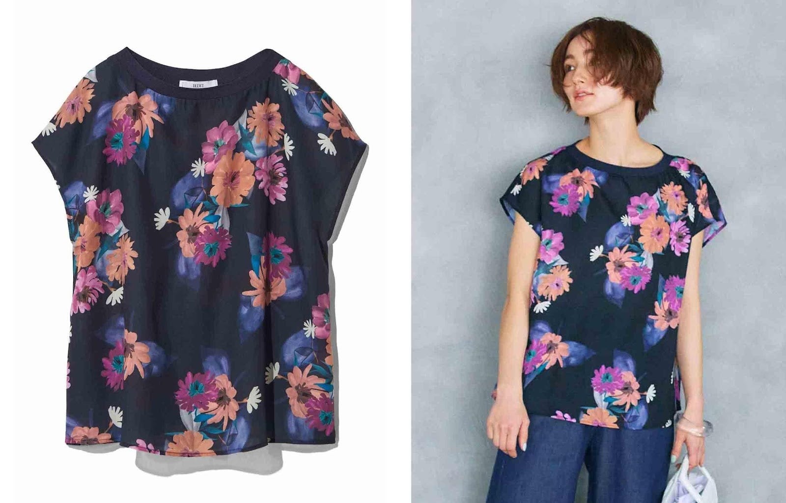 にじんだようなタッチと深い色使いのアートな花柄に女性らしさがあふれるブラウスです。からだが泳ぐサイズ感とフレンチスリーブで華奢(きゃしゃ)な印象を持たせつつ、衿ぐりのリブ遣いでカジュアルさも演出できます。甘さをおさえた凛とクールなたたずまいが、辛口な着こなしにもマッチします。