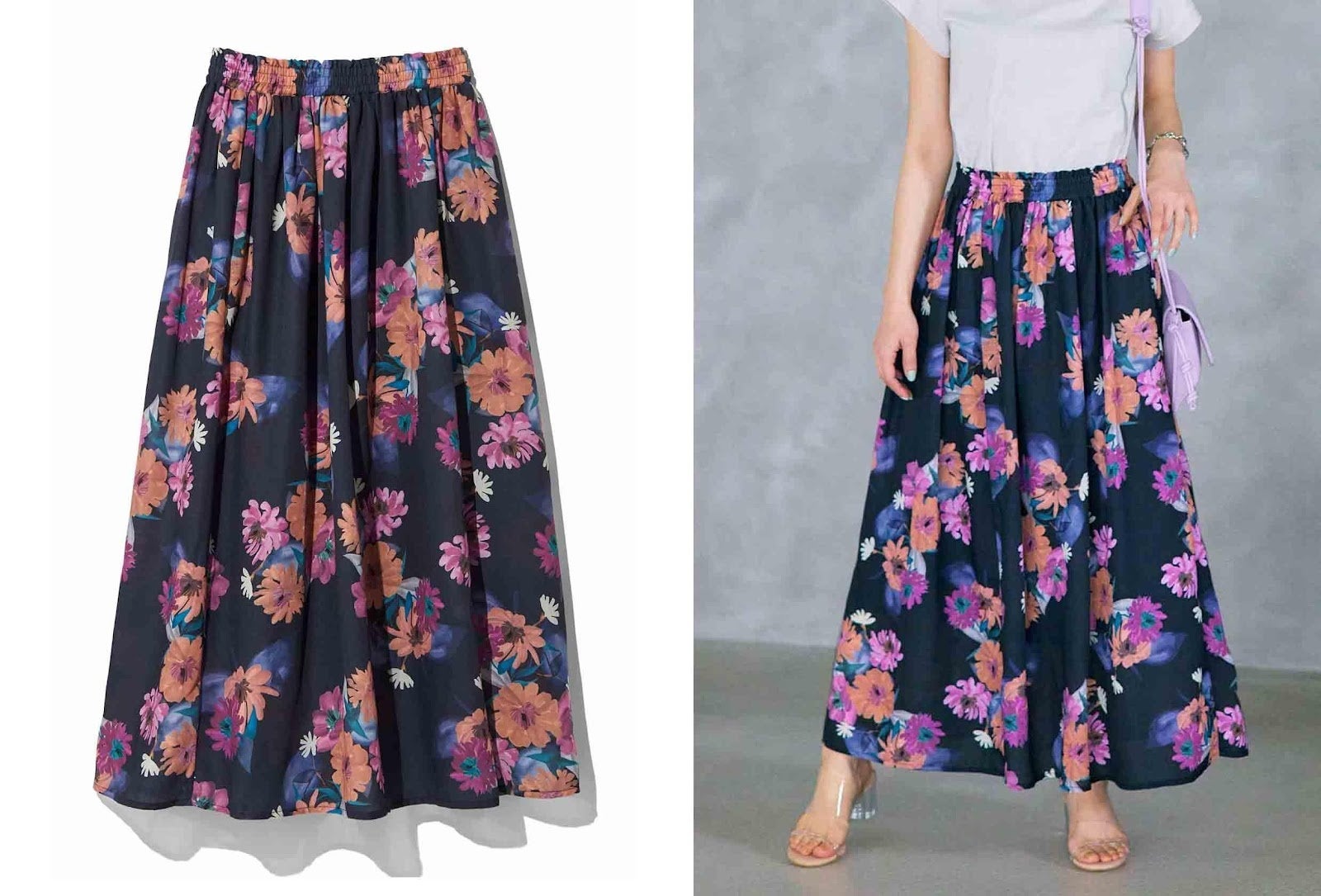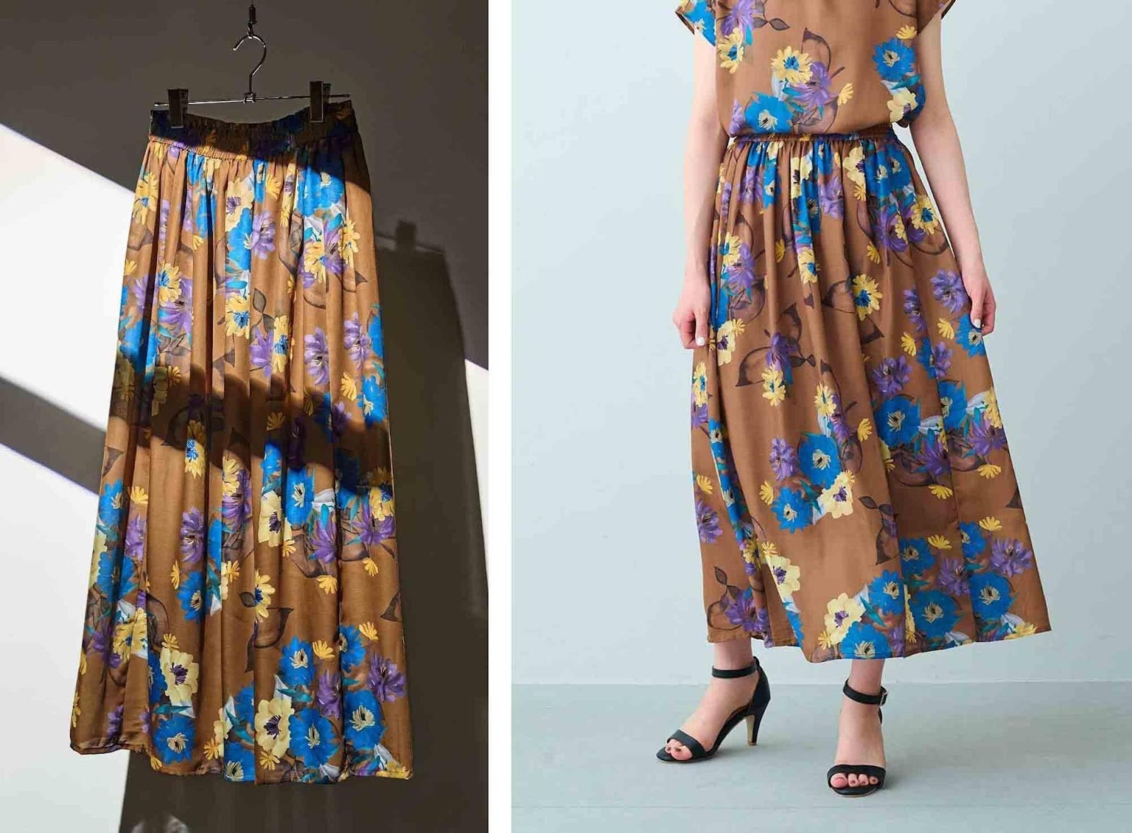 上のブラウスとセットでも、シンプルなTシャツを合わせるだけでも使えるスカートです。凛(りん)とした花柄プリントのモードな世界観を映すように、すとんと落ちるような大人っぽいシルエットに仕上げています。アクセントを作るウエストシャーリングで、今っぽさとこなれ感も醸し出せます。