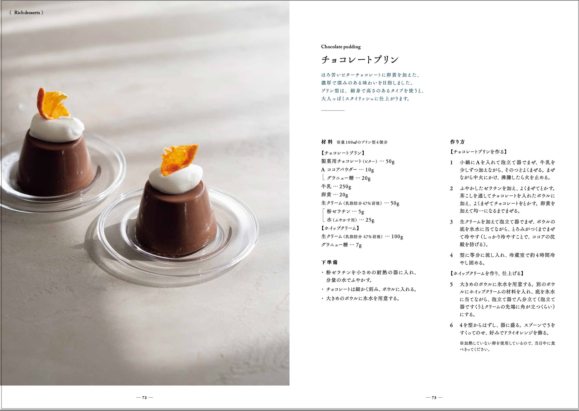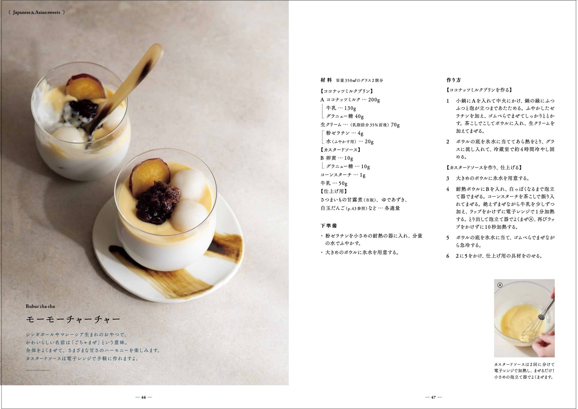 その言葉通り、フルーツのゼリーに始まり、和とアジアのおやつ、カキ氷やドリンクも含めたフローズンデザート、プリンやクレームブリュレなど濃厚なデザートまで、46点ものレシピを収録。