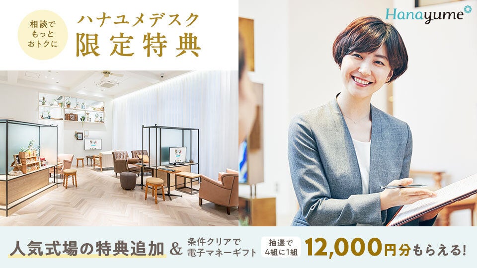 ハナユメは、このアドバイザーによる対人相談サービスをさらに強化し、より多くのカップルに「理想の結婚式」を見つけていただきたいと考えています。その第一歩として、この度『ハナユメデスク限定特典』をご用意しました。