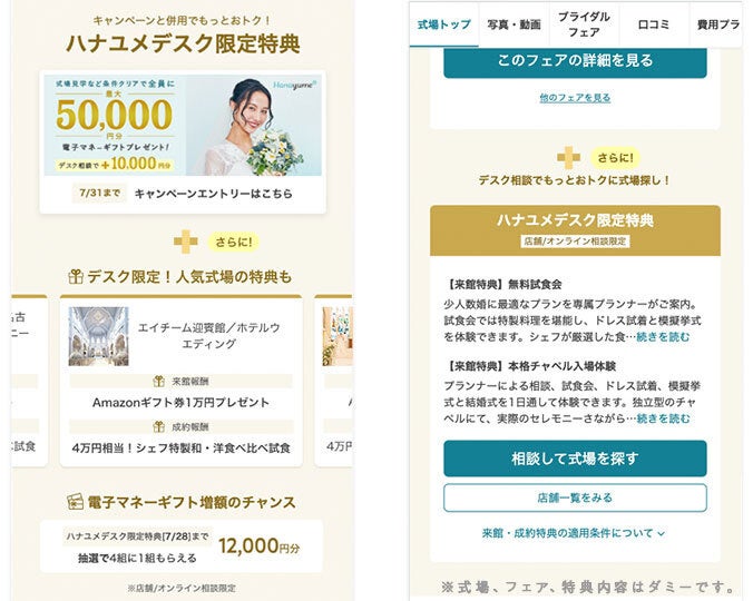 今回リリースした『ハナユメデスク限定特典』は、『ハナユメウエディングデスク』および『ハナユメオンライン相談』をご利用のお客様限定で、常時ご提供する来館・成約特典です(一部式場を除く)。