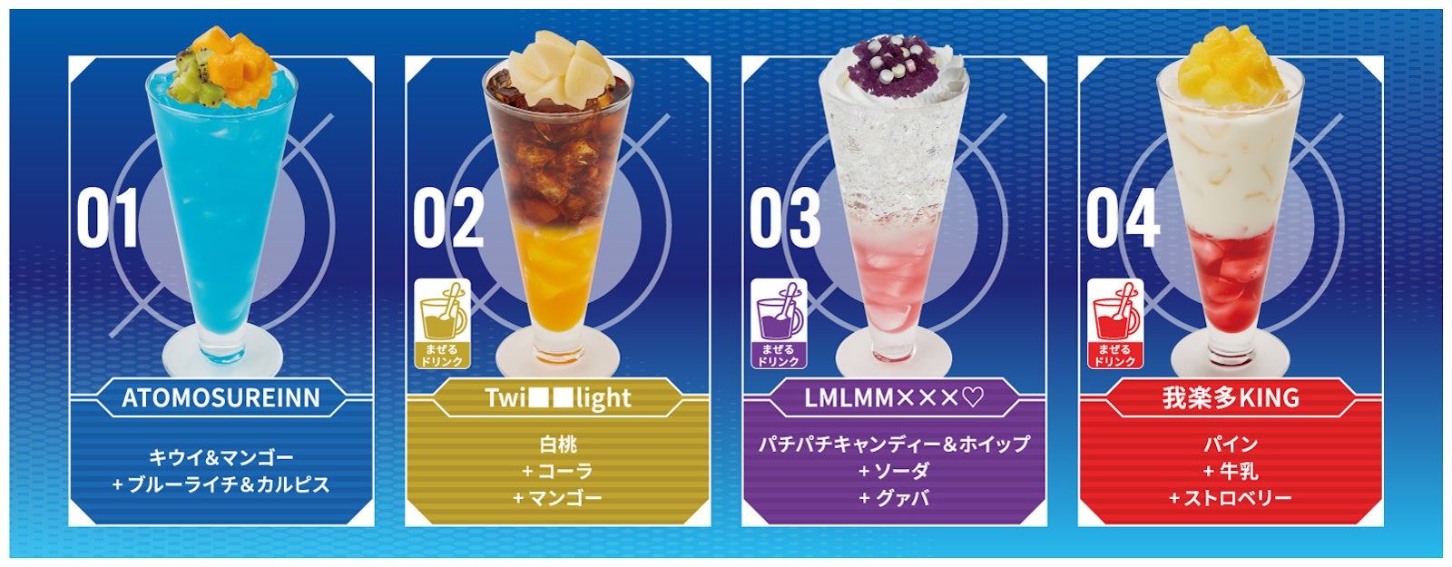 コラボドリンクは、「ATOMOSUREINN」「Twi■■light」「LMLMMxxx♡」「我楽多KING」をイメージした全4種をご用意します。