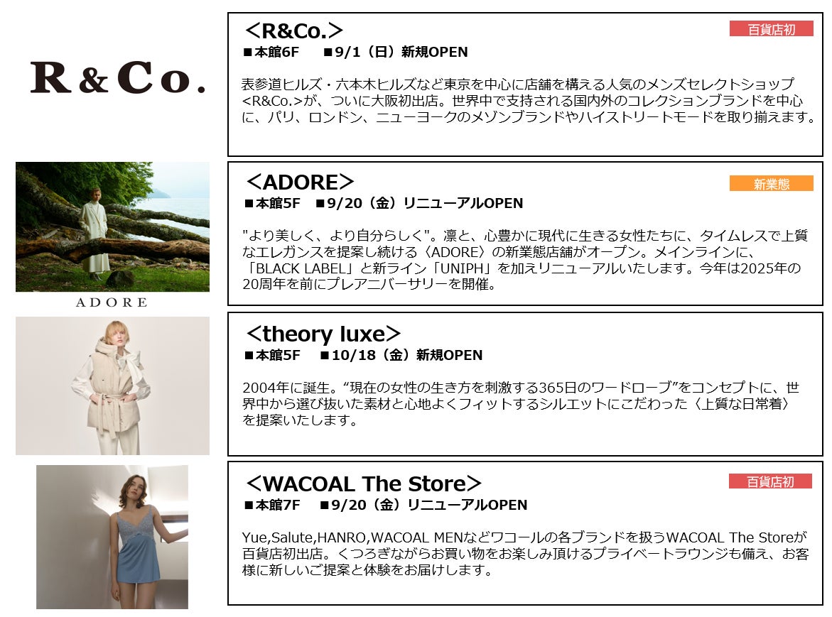 大丸心斎橋店では6月に先行公開した13店舗と合わせ、計66店舗のリニューアルが進行中。本リリースでは、新規出店29店舗、エリア最大級や新業態としてリニューアルオープンする7店舗の計36店舗をピックアップしてご紹介。全店舗の詳細は別紙資料をご参照ください。