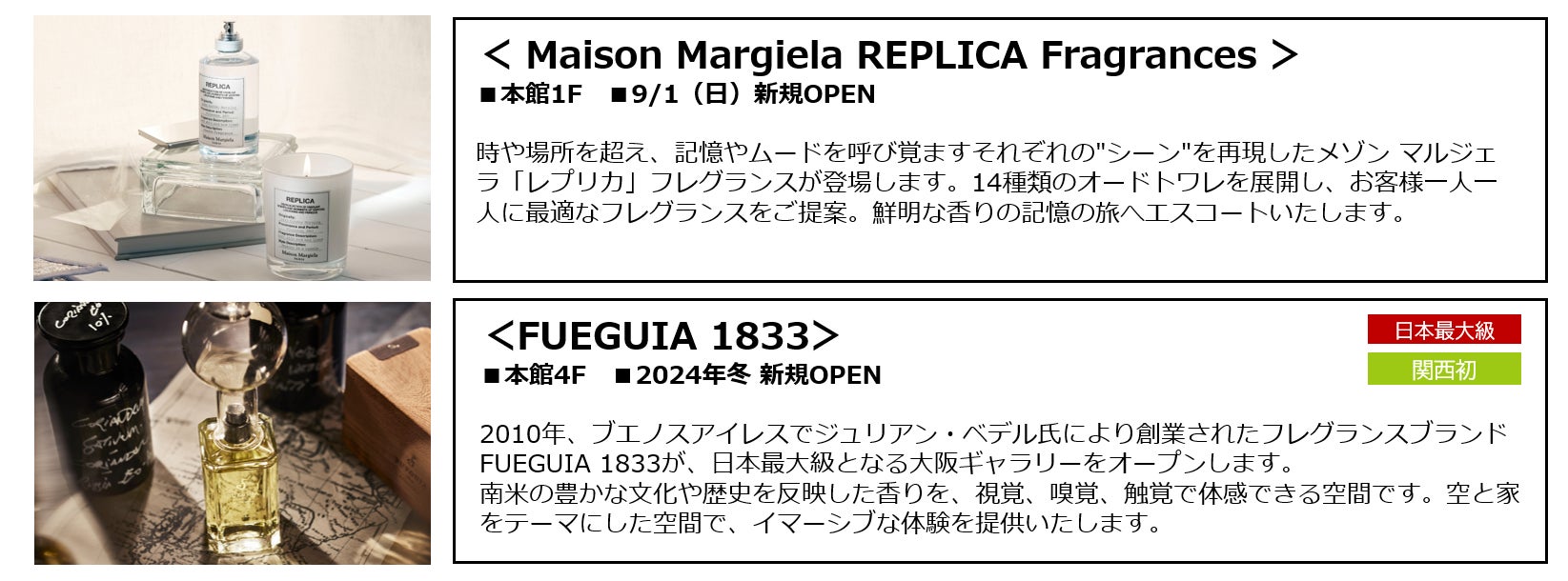 関西最大級となる〈JIL SANDER〉や、関西初出店の〈AMIRI〉のほか、ブエノスアイレス発のフレグランスブランド〈FUEGUIA 1833〉が新たに登場。6F時計売場の面積を65%拡大するなど、時流を捉えたラグジュアリーカテゴリーを強化。日本の伝統工芸やポップカルチャーなどグローバルに評価されるコンテンツを拡充します。また、〈日本橋西川〉は最新のデジタル機器を備えた体験型ショールームへ、〈WACOAL The Store〉はワコールの各ブランドを扱う初のコンバイン型店舗としてリニューアル。従来の百貨店にはない独自性の高い売場で、ここでしか得られない体験や喜びをお届けしてまいります。その他、人気ブランドの旗艦店や新業態も多数登場。新しい大丸心斎橋店にぜひご期待ください。