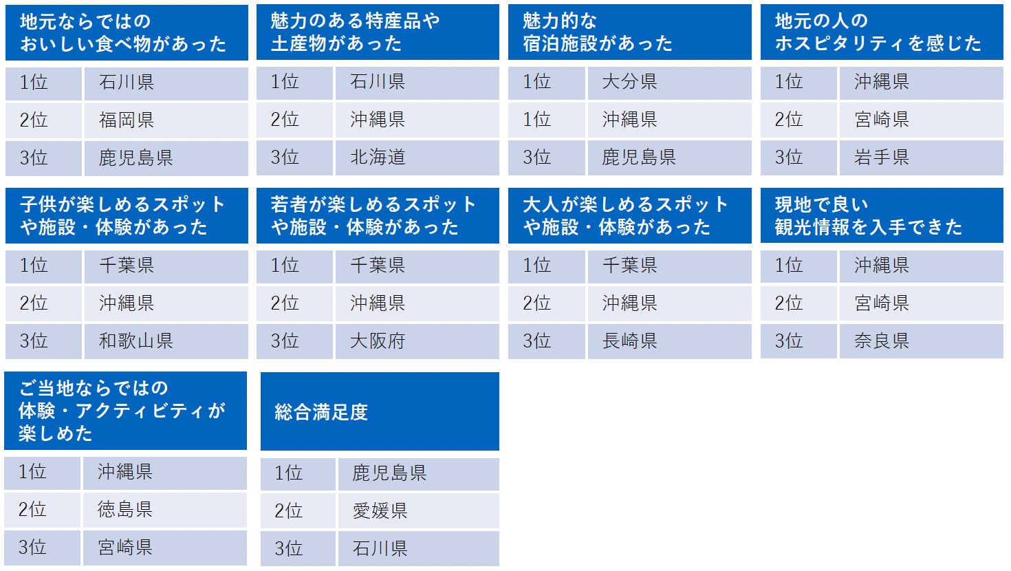 総合満足度1位は鹿児島県が獲得しました。テーマ別ランキングでもトップ10に多くランクインしています。シニア層を中心に夫婦旅行などで多く訪れているようです。コロナからの本格的な観光回復の年ではありましたが、円安の影響もあり海外旅行が敬遠される中、首都圏や関西圏から飛行機で訪れることができるエリアの評価が高いようです。また2024年1月には能登半島地震があった石川県ですが、食やお土産では上位を獲得し、2023年度は総合満足度で3位と、高い評価を得ています。アクセスの良さや知名度から有名都市や観光地を訪れる人は多いですが、満足度の軸で見るとその顔ぶれも多彩です。訪日客も増える中、国内宿泊旅行で満足のいく観光地とはどのような地域か、引き続き注目していきたいと思います。