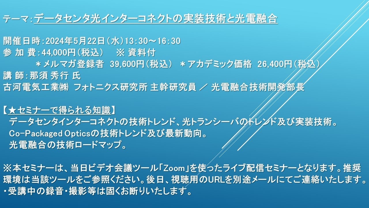 【ライブ配信セミナー】データセンタ光インターコネクトの実装技術と光電融合 5月22日(水)開催 主催:(株)シーエムシー・リサーチ