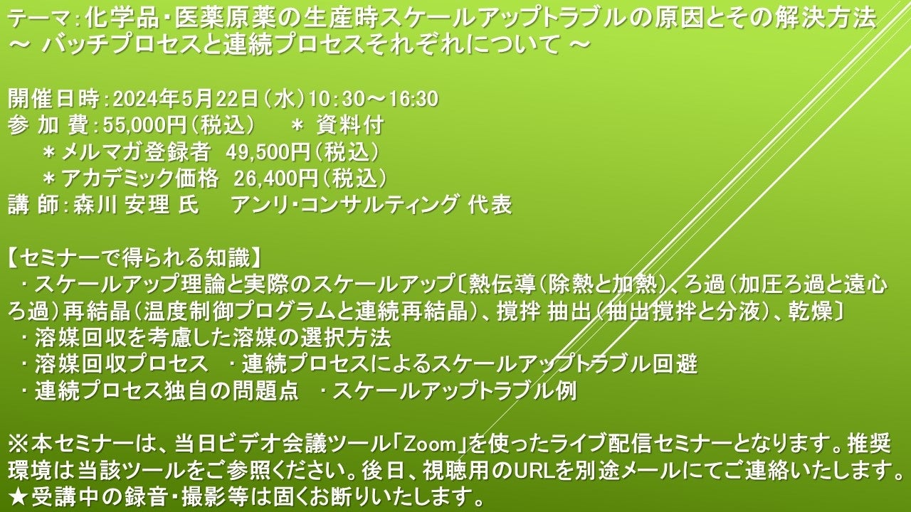 【ライブ配信セミナー】化学品・医薬原薬の生産時スケールアップトラブルの原因とその解決方法 ~ バッチプロセスと連続プロセスそれぞれについて ~ 5月22日(水)開催 主催:(株)シーエムシー・リサーチ
