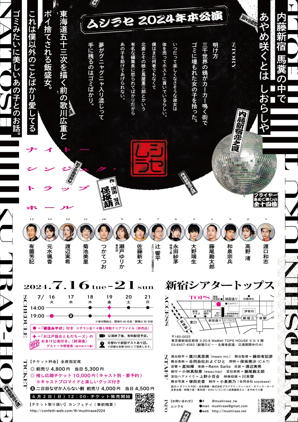 ムシラセは過去3本、「創作と表現」をテーマに作品作りをしてきました。その集大成として「作り手の業と消費」を書かなければ、次に進めないだろうと感じています。 ゴミだらけの新宿を舞台に、歌川広重「江戸名所百景・内藤新宿」の浮世絵から江戸に旅する男の子の、夢と現実がぐちゃぐちゃに混ざったお芝居です。 新宿で新宿のお芝居をかけるのは滅多にない機会です。 ぜひ劇場でお待ちしております。