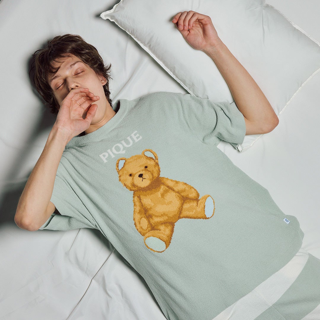 薄手の’エアリーモコ’ 素材で軽やかに仕上げた、ピケベアモチーフのプルオーバーです。夏らしい爽やかな配色と、さらっとした肌触りで、初夏のおうち時間にリラックス気分をお届けします。