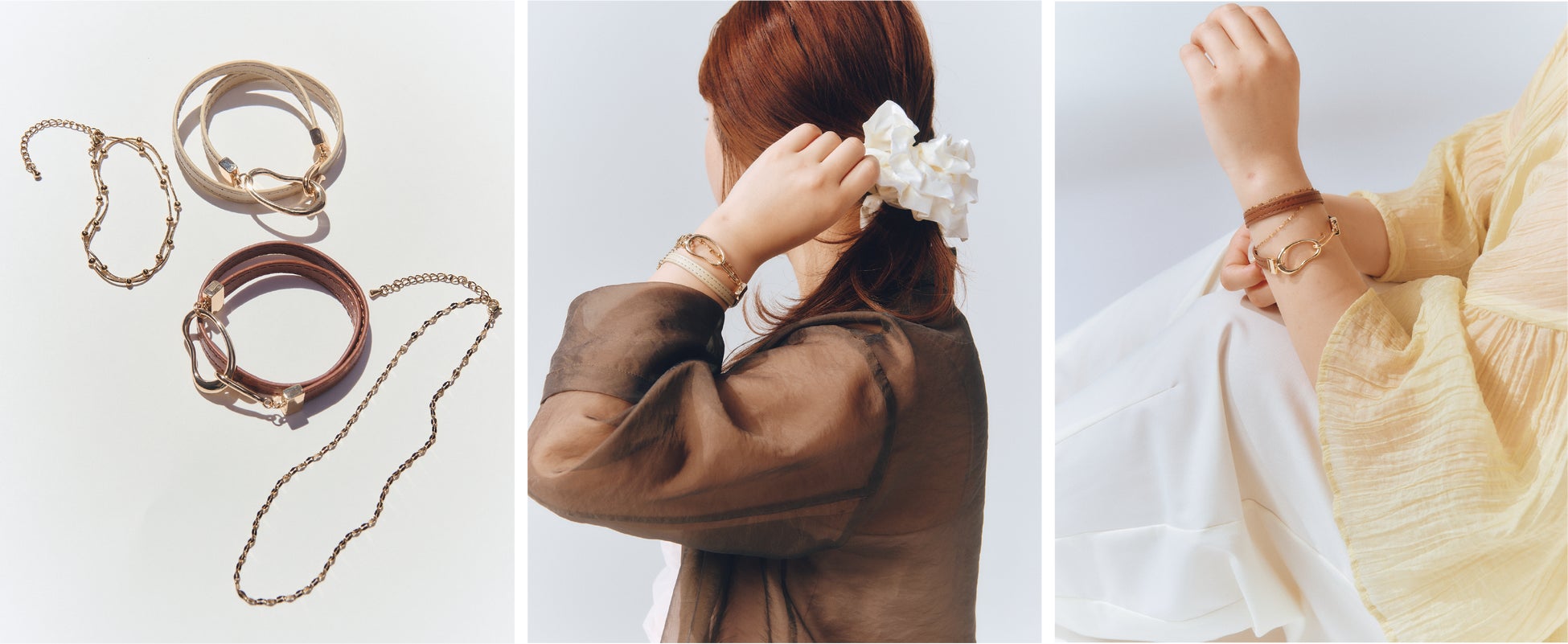 レザーとチェーンの 2Pバングル。単体でもセットでも楽しめるアイテムです。ビーンズ型の金具がデザインポイントで手元を華やかにしてくれます。チェーンは、ネックレスとしても使えるので、その日の気分やコーディネートに合わせて様々な使い方で楽しんでいただけます。