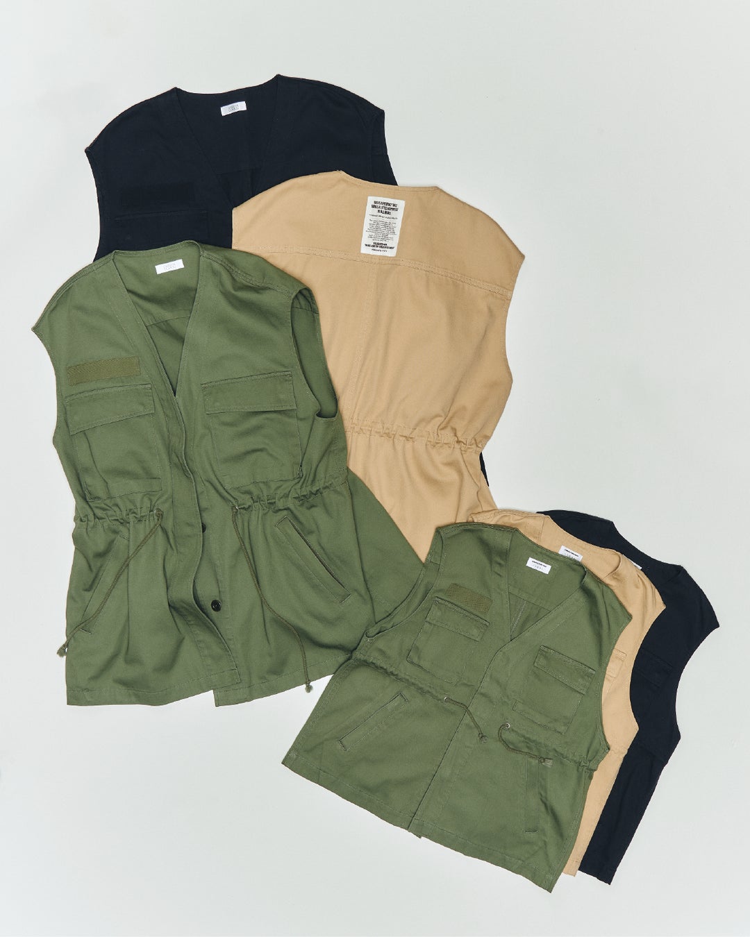 王道のミリタリーデザインベスト。 丈感やアームホールにゆとりを持たせることでTシャツやブラウスはもちろんスウェットの上にも着用できるサイズ感に仕上げました。サイドポケットはジップ付きのデザインにすることで自転車通勤でも落下を気にすることなく、ママたちの日常のちょっとした悩みに寄り添うアイテムです。背面のタグには、毎日頑張るママへのメッセージが施されているのもポイントです。