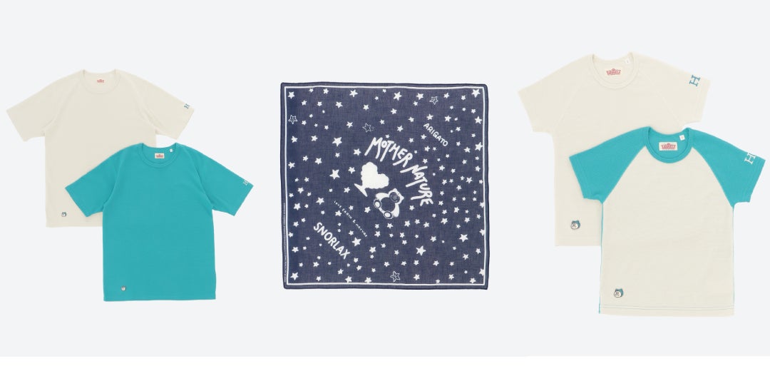 左から:<ハリウッド ランチ マーケット>HRM Stretch Fraise CREW NECK COMFORTABLE SS KABIGON TEE 13,200円、HRM MOTHER NATURE KABIGON BANDANA 2,970円、HRM Stretch Fraise KIDS CREW NECK SS KABIGON TEE 8,250円