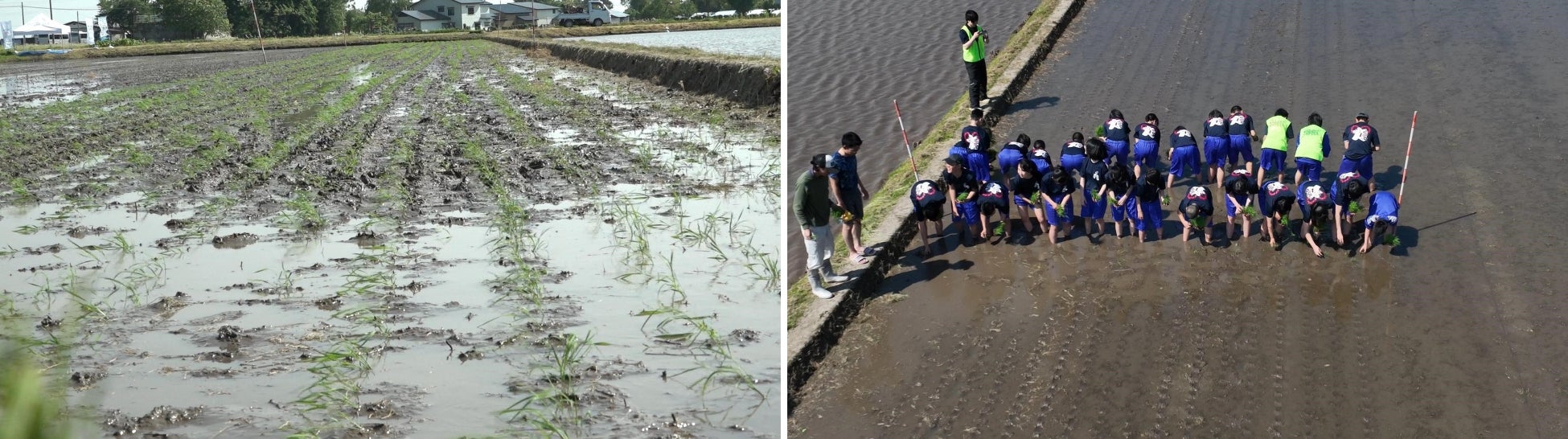 最初は恐る恐る進んでいた生徒たちも慣れてくるとスピードアップ。30分ほどで予定していた場所の田植えを終了しました。