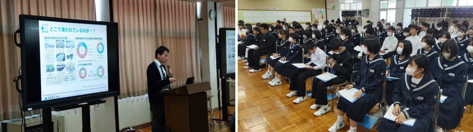 今回参加するのは角館中学校の1年生86人。田植えを実施する前に、なぜ田植えで「海洋ごみゼロ宣言」なのか?農業分野からどんなごみが海に流出しているのか?を学ぶために、海洋ごみ対策を学ぶ特別授業を受講しました。この特別授業は秋田県立大学システム科学技術学部機械工学科の境英一准教授が県内の各中学・高校に出向き、生徒に海洋ごみやマイクロプラスチック、プラスチックリサイクルの話を分かりやすく教えています。