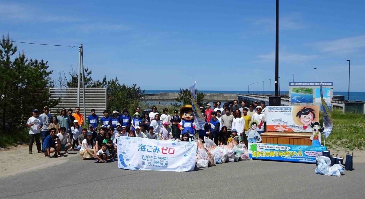 自然に感謝を込めてのビーチクリーン。昨年より1か月ほど早い時期の清掃活動でしたが、大型のプラスチックかごや、油などを入れていたと思われる大型容器がとても目立ちました。ビーチクリーンをとりまとめる矢作さんは、この浜にはあまり打ち上げられることのない「海洋ごみ」が今年は多く、1月の能登半島沖地震の影響もあるのではないかと語っていました。最後は「三平くん」も入って皆さんと記念撮影!参加者からは、また夏にも活動できたら良いね、との声がよせられました。