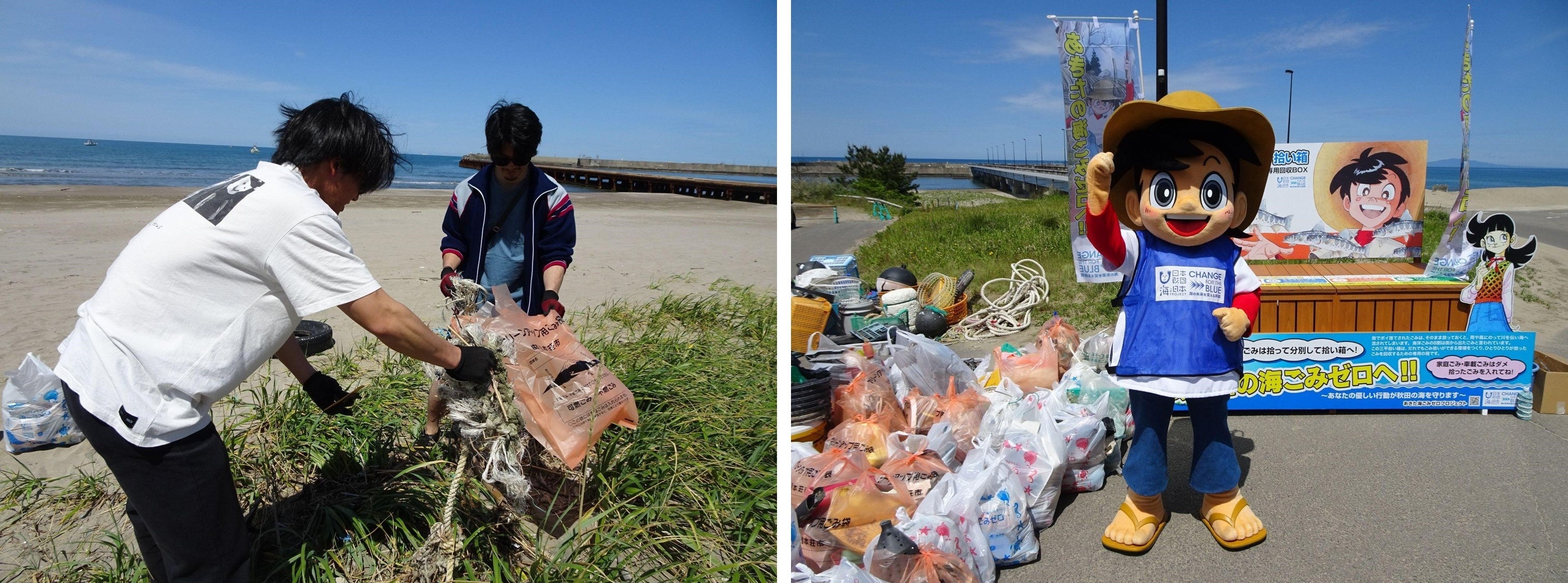 秋田県由利本荘市岩城は、県内有数のサーフィンスポットで、多くのサーファーが利用しています。本イベントは、サーフィンができる海、自然に感謝の意味を込めて海洋ごみの流出を防ぐ目的で開催されています。サーファービーチクリーンは毎年家族連れで参加する方が多く、この日は、三平くん率いる「釣りキチ三平ごみ拾い隊」や、出前式の「釣りキチ三平拾い箱」も会場に設置し、お子様にも楽しんでもらいながらのごみ拾いイベントを実施しました。ビーチには、大小さまざまなプラスチック系のごみや砂浜に打ちあげられた漁網、ペットボトルなど多くの海洋ごみが集められました。集められた海洋ごみは、三平くんが待ち構える拾い箱前で分別・回収され、誰でもいつでも気軽にごみ拾いができる仕組みをつくろうという「拾い箱プロジェクト」の啓発にも取り組みました。
