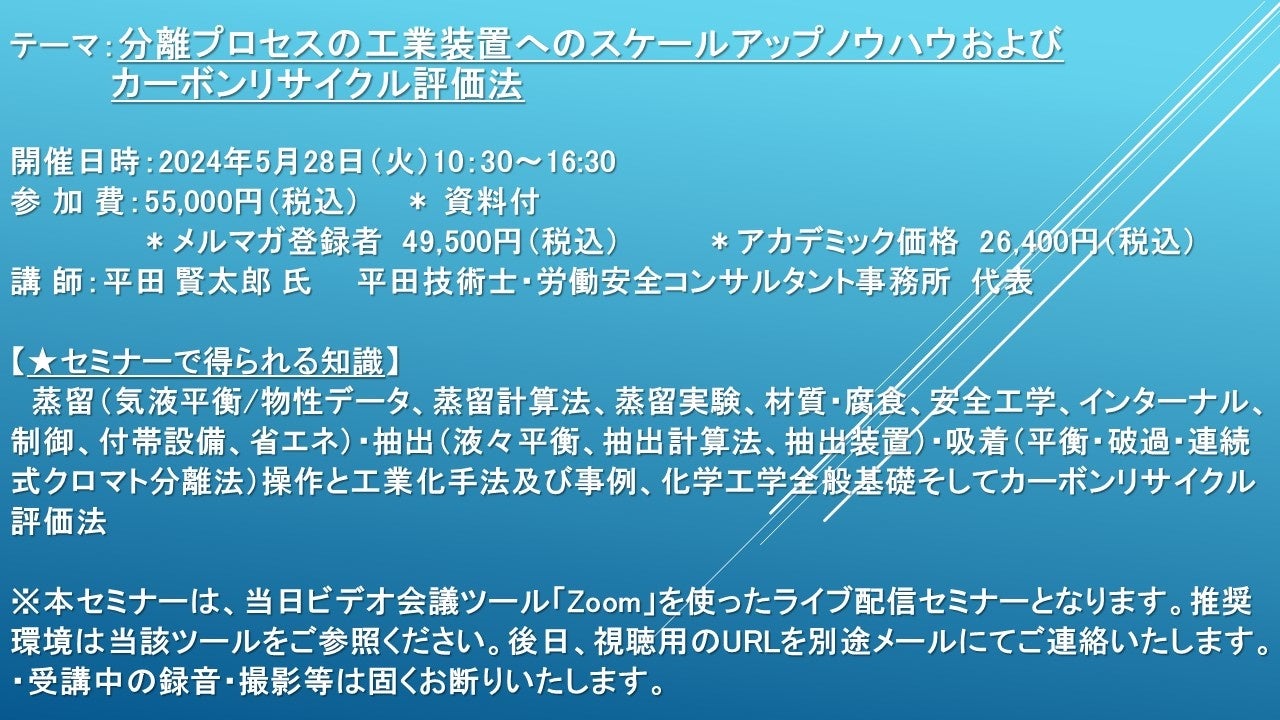 【ライブ配信セミナー】分離プロセスの工業装置へのスケールアップノウハウおよびカーボンリサイクル評価法 5月28日(火)開催 主催:(株)シーエムシー・リサーチ