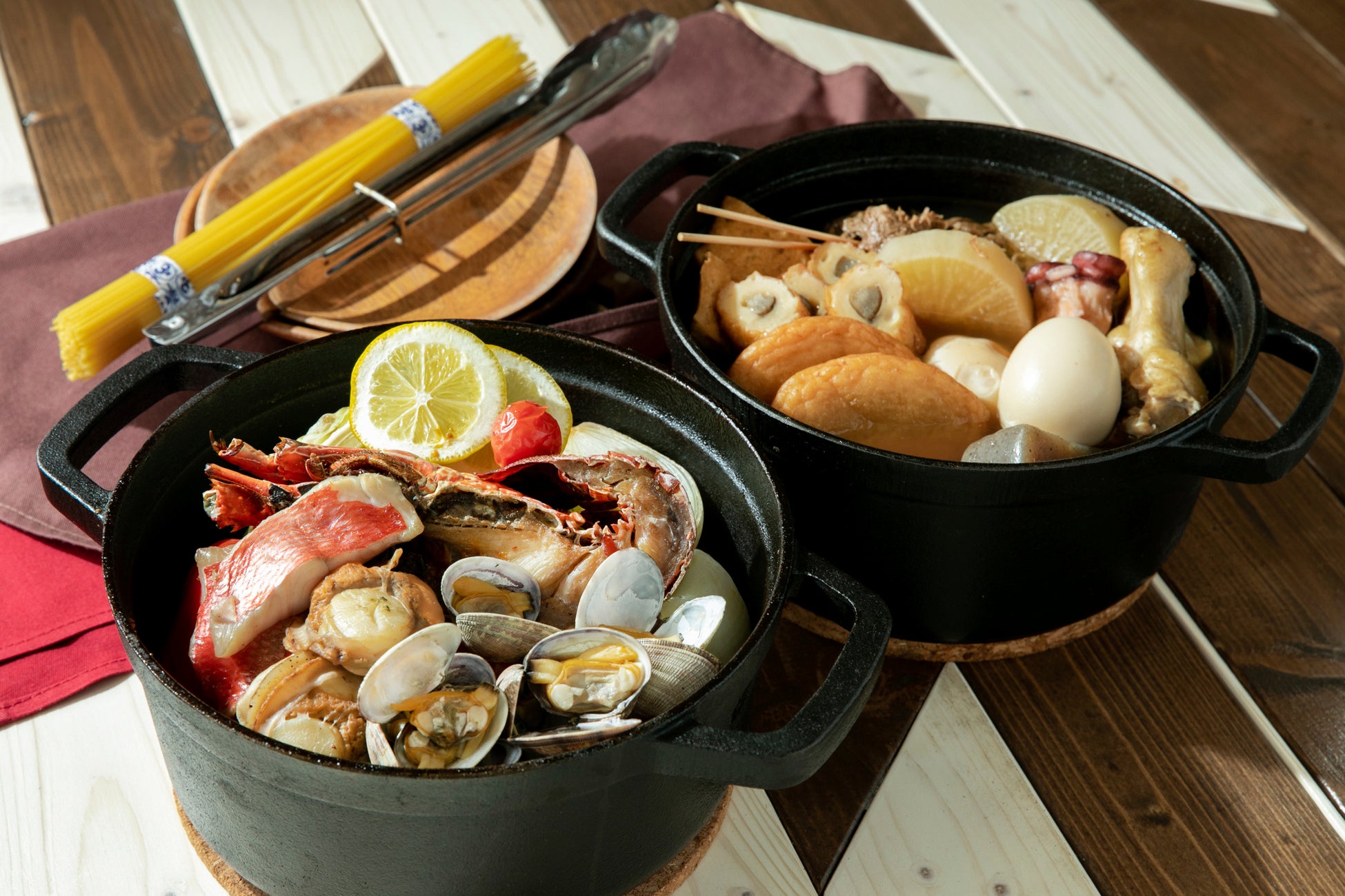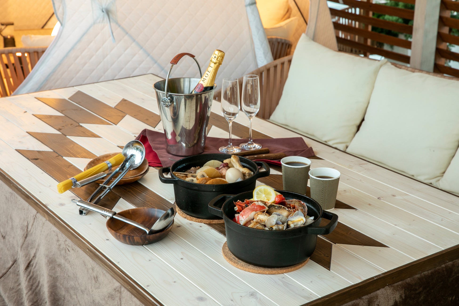 また、お料理には、バラエティ豊かな鍋メニューが登場。あっさりとした味わいのシェフが作る関西風おでんや、伊勢海老(外国産)と魚介類、野菜をたっぷり使用し、コクと旨みが詰まった贅沢なブイヤベースなどをアウトドアらしいダッチオーブンでご提供いたします。ホットワインや日本酒熱燗、焼酎お湯割りなどのホットドリンクもラインナップ。身体の中からも温まる、あったかメニューです。