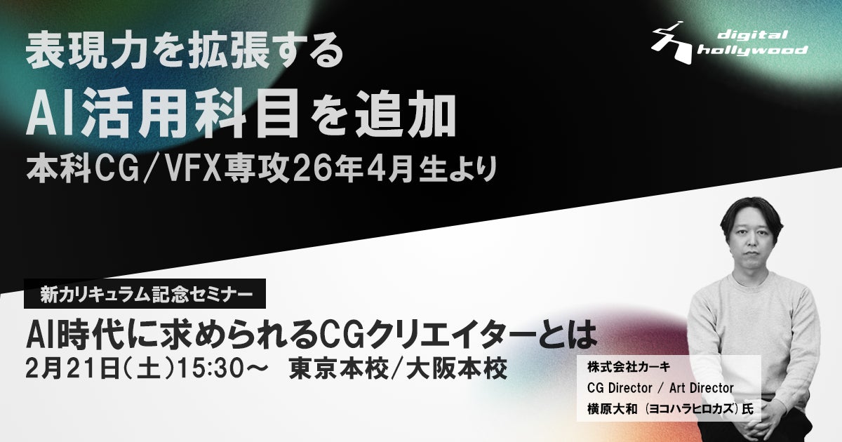 IT関連及びデジタルコンテンツの人材育成スクール[デジタルハリウッド] (運営会社:デジタルハリウッド株式会社、本社/本校:東京都千代田区、代表取締役社長兼CEO:藤井雅徳、学長:杉山知之)では、「確かな制作技術を有し、さらにAIを道具として使いこなすことで、最短距離で最高到達点へ駆け上がるクリエイターとなること」を目指し、フラッグシップコースである「本科CG/VFX専攻」において、2026年4月開講クラスより、AIを活用した新カリキュラムを追加します。