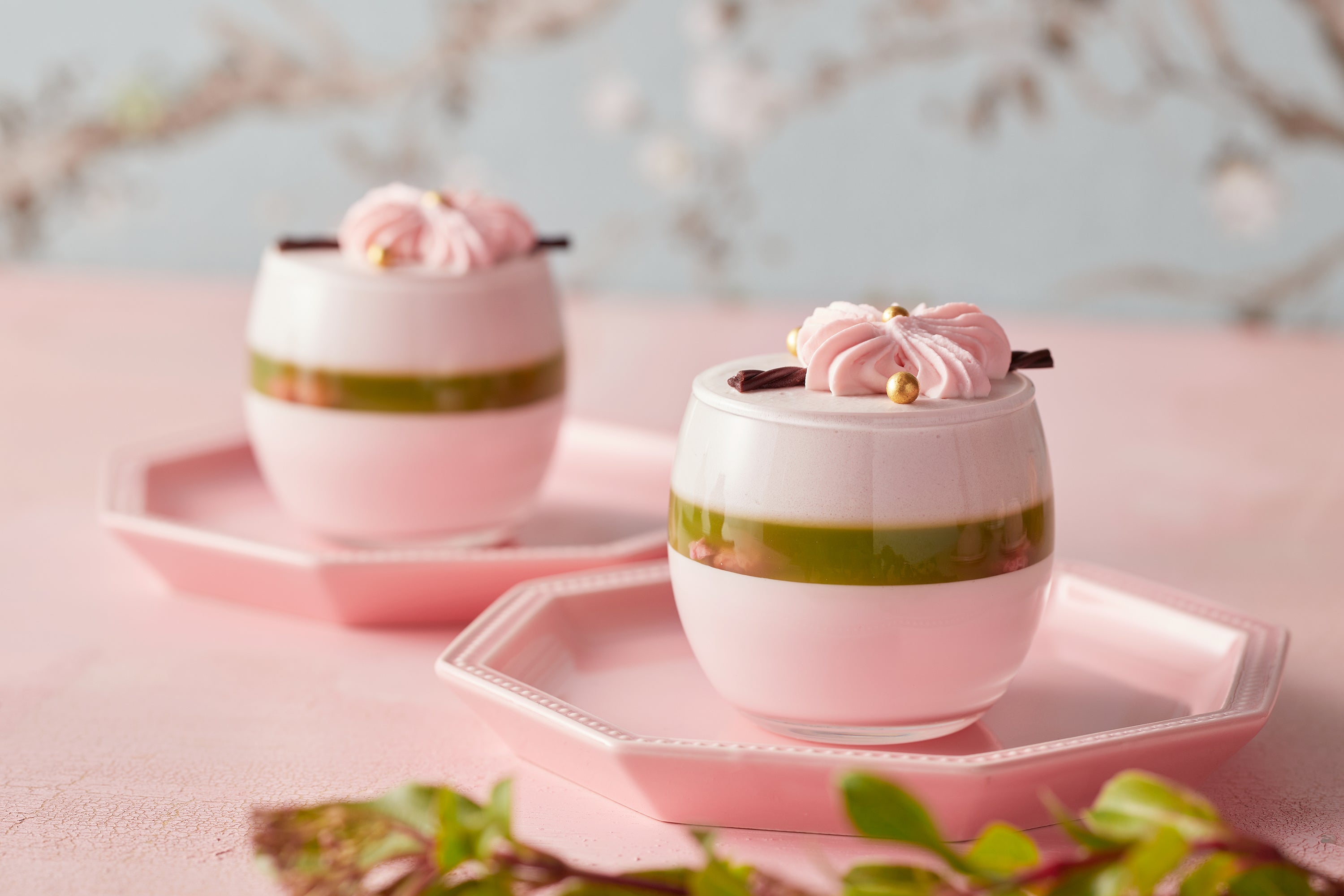桜のパンナコッタに、よもぎと桜の塩漬ゼリー、こし餡の生クリームを重ねました。トップには桜の花びらに見立てたクリームをあしらい、桜の甘味とよもぎの爽やかな香りを存分に味わえる見た目も美しい一品です。
