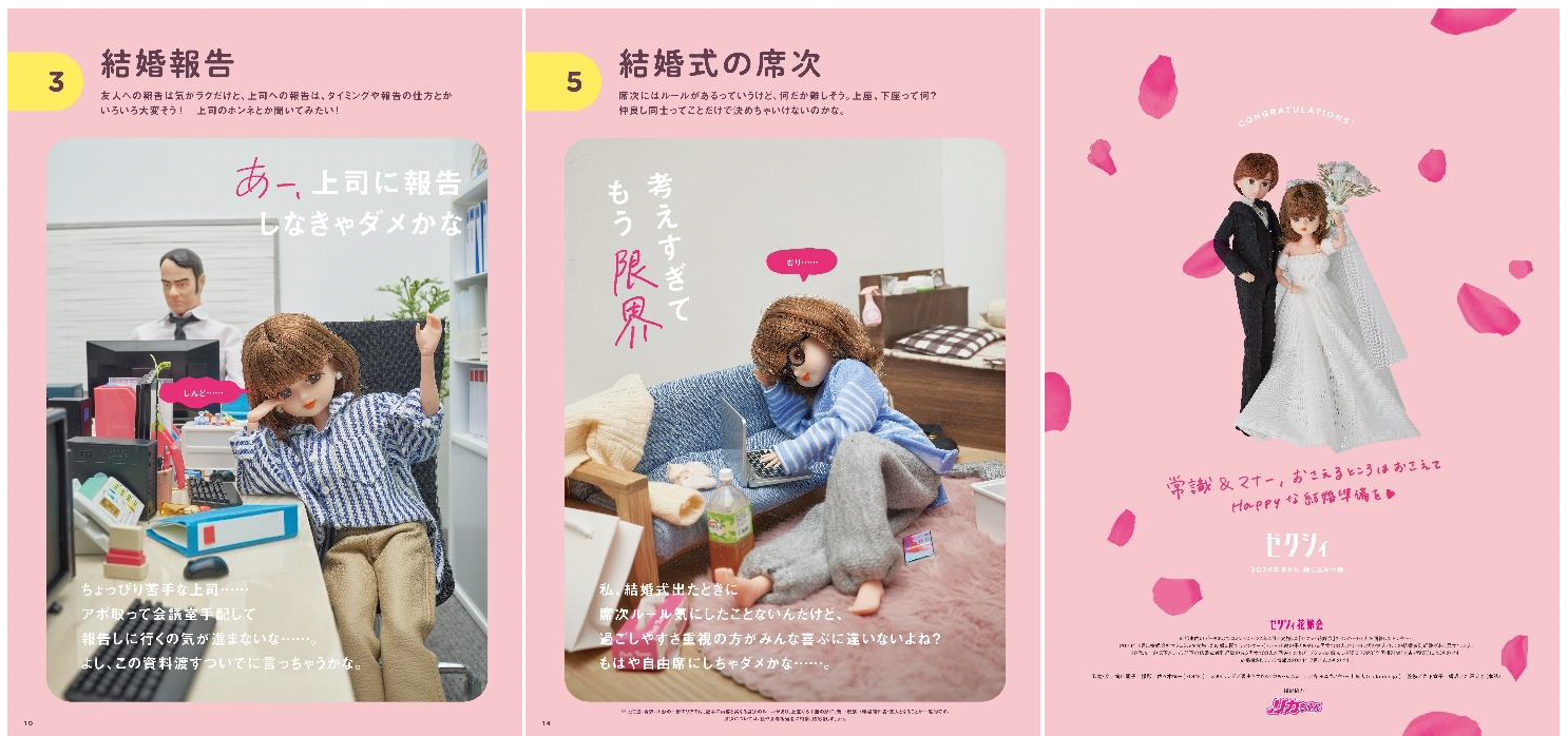 リカちゃんファンのOL(現実を生きる管理人)が自身の日常をリカちゃんに投影しているYouTubeアカウント「現実を生きるリカちゃんねる」が『ゼクシィ』とまさかのコラボ。ストレス社会で頑張るズボラな“リカちゃん”が、難しいと思われがちな「結婚式の常識&マナー」に挑戦します。誌面にはリカちゃんの「フォトジェニックリカ」シリーズ(2024年9月下旬発売予定)、「デイジー」が登場します。大変な花嫁の準備と気持ちに寄り添って応援する、リカちゃんらしいコラボ企画です。