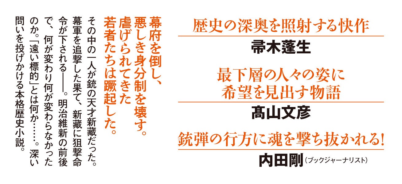 彼もまた最下層に生きる青年であると同時に、一発必中の銃の名手です。その新藏に重大な狙撃命令が下されます……。その「標的」と「一発の銃弾」は驚くべき展開を呼び、維新後の知られざる悲劇へとなだれ込みます。
