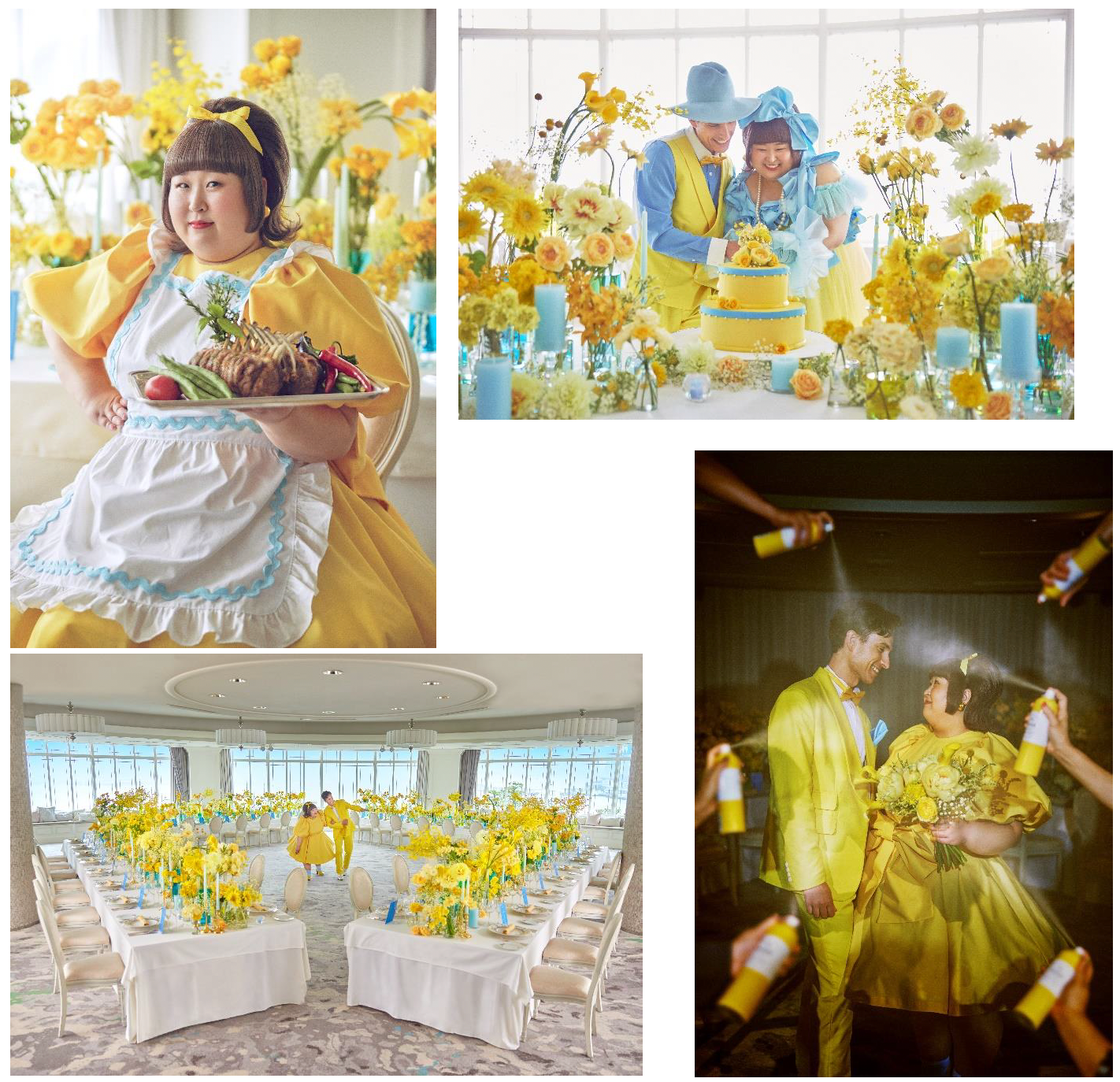 『ゼクシィ』がさまざまなクリエーターとコラボレーションして「結婚式って自由なんだ!」というメッセージを伝える連載企画。今回は多方面で活躍するお笑い芸人・3時のヒロイン/かなでさんが考える理想の結婚式を、『ゼクシィ』サポートの下で実現しました。かなでさんのテーマは「ミュージカルの世界に飛び込んだような結婚式」。自身の大好きなミュージカルの世界観の中、これも大好きな黄色を基調に水色と白で衣裳や会場をコーディネート。今回のために作られた花嫁衣裳については、「担当してくださった方に『私の本当の結婚式でもお願いすることはできますか?』と直接聞きました」というほどお気に入りの様子でした。