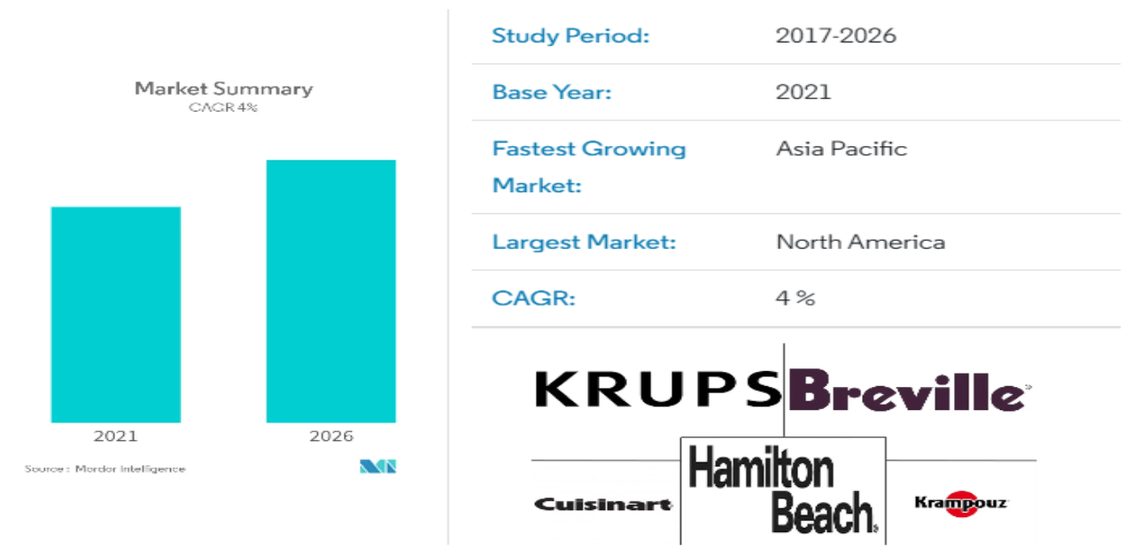 ワッフルメーカー市場は、予測期間(2021年~2026年)に年平均成長率4%を記録すると予測されています。