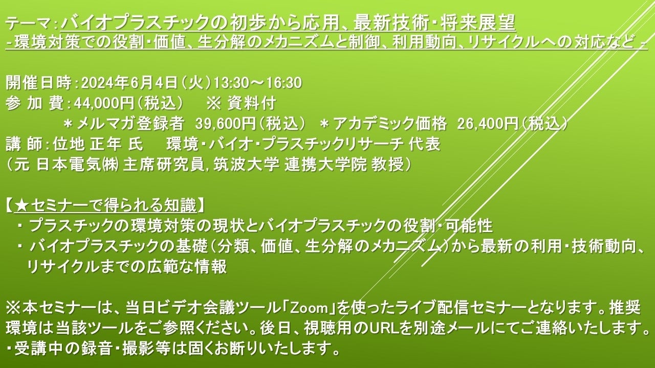 【ライブ配信セミナー】バイオプラスチックの初歩から応用、最新技術・将来展望 環境対策での役割・価値、生分解のメカニズムと制御、利用動向~ 6月4日(火)開催 主催:(株)シーエムシー・リサーチ