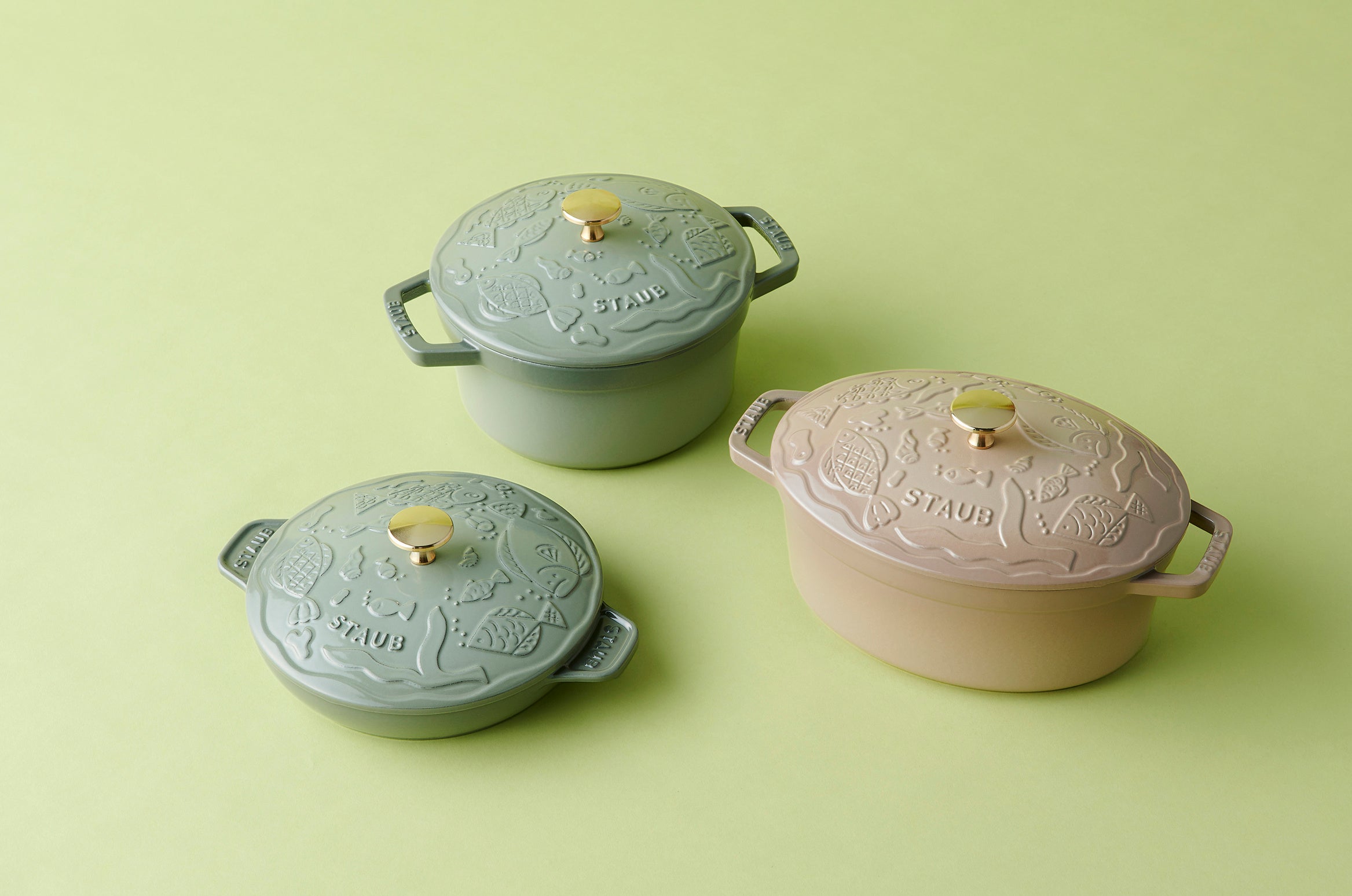 海藻がゆらめく中で魚や貝が暮らす“海の世界”を表現した<ストウブ>鋳物ほうろう鍋のコレクション「cocotte ocean」。落ち着きのある優しい色合いは、白身魚や野菜など食材の色とよく調和し、料理を引き立てます。