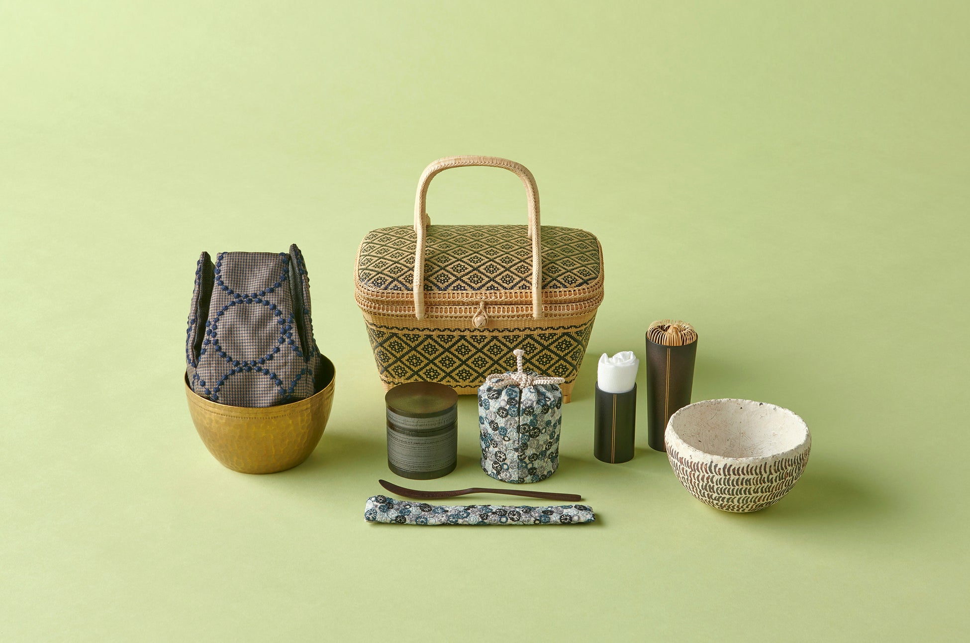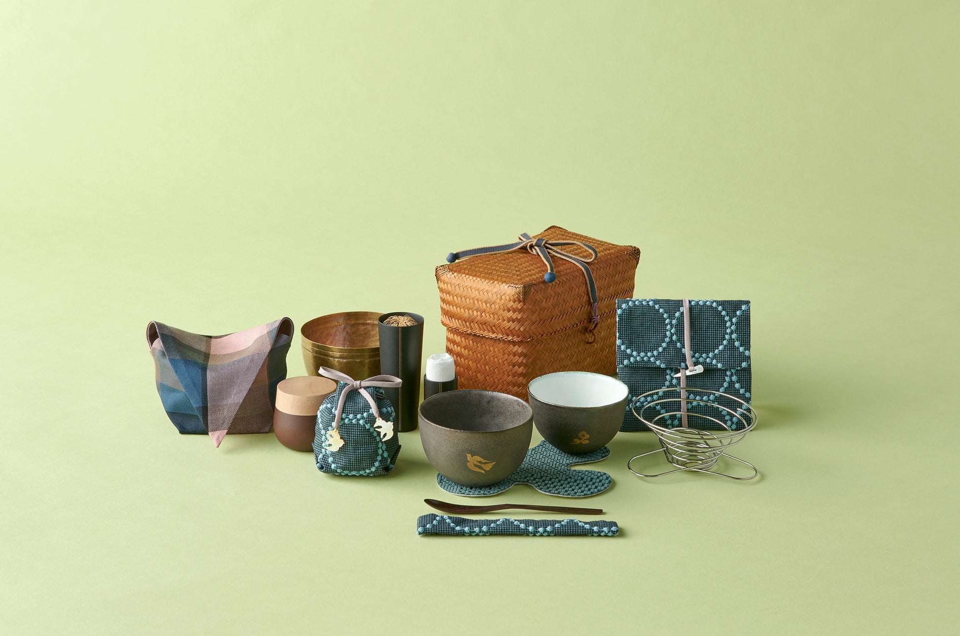 <嘉門工藝>がお届けする今回の<ミナ ペルホネン>コラボレーションは、陶芸家・造形作家の内田 鋼一氏と陶作家の安藤 雅信氏、漆芸家の村瀬 治兵衛氏を迎えた夢のコラボレーション。内田氏の茶碗に村瀬氏の茶器を取り合わせ、安藤氏の茶碗は2碗組で、抹茶とコーヒーどちらでもお使いいただけるようドリッパーがセットになっています。茶道具を入れる袋を<ミナ ペルホネン>のテキスタイルで仕立てました。