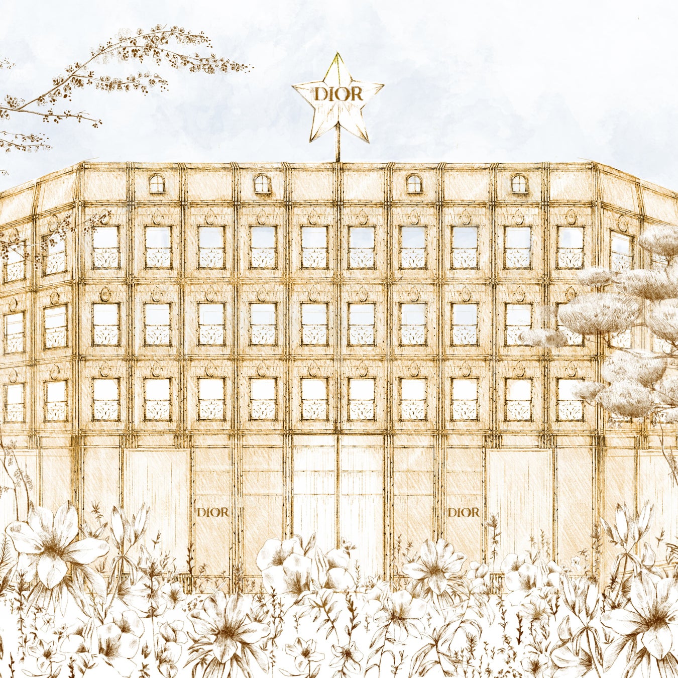 1947年より、ディオールの運命を導いてきた星に見守られた壮麗な建築は、パリの本店「30モンテーニュ」のファサードをゴールドに染め上げたバンブーで再解釈しています。日本の竹林に着想を得たこのセノグラフィーは、夜にはライトアップされます。