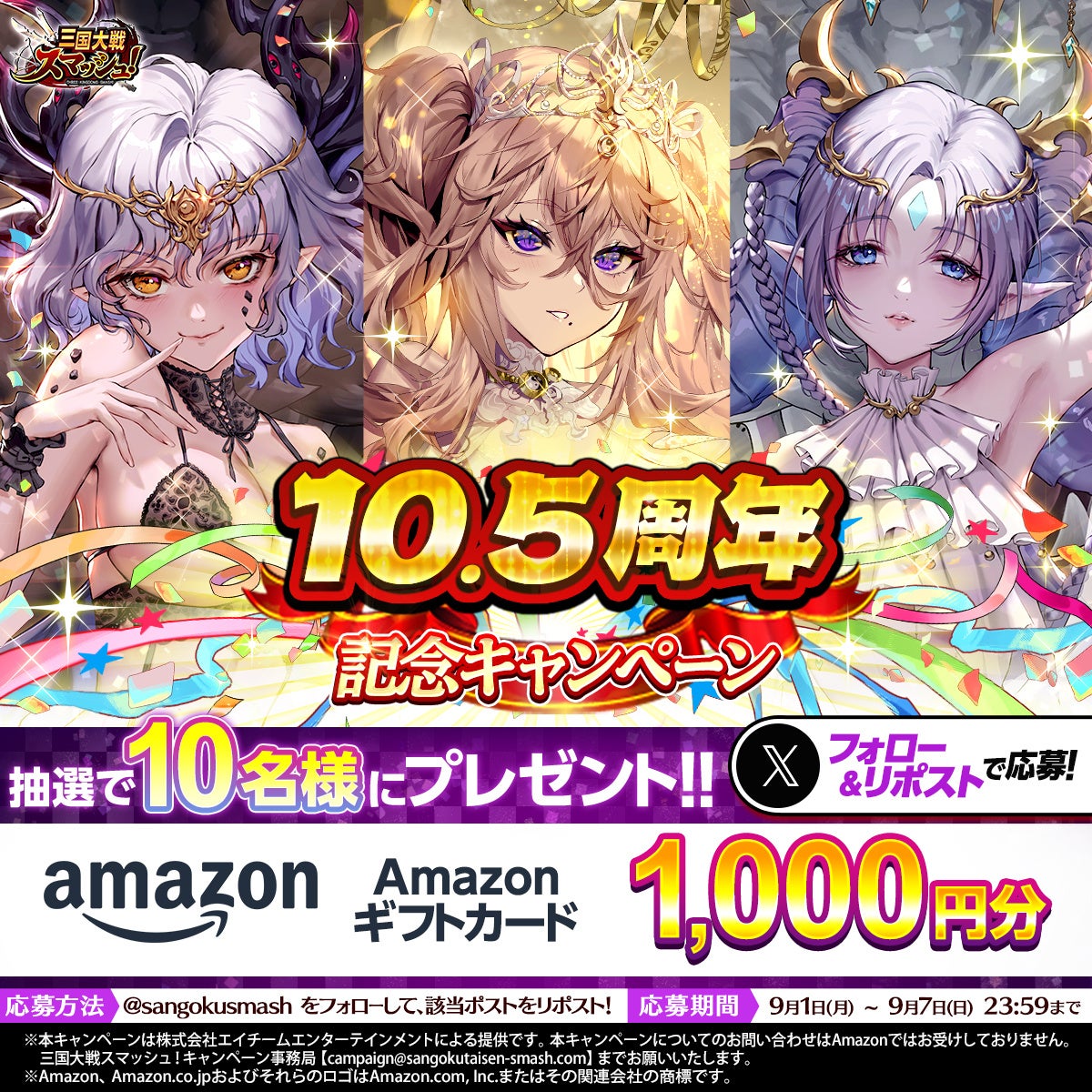 さんすま公式Xで10.5周年記念キャンペーンを開催します。公式X (@sangokusmash)をフォローして、対象ポストをリポストした方の中から抽選で10名様に「Amazonギフトカード 1,000円分」が当たります。
