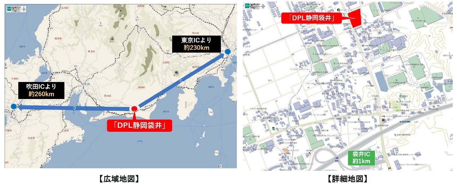 「DPL静岡袋井」は、東名高速道路「袋井インターチェンジ」より1km圏内(車で約5分)、新東名高速道路「森掛川インターチェンジ」より10km圏内(車で約40分)に位置し、東名・新東名ともに円滑にアクセスできる立地です。